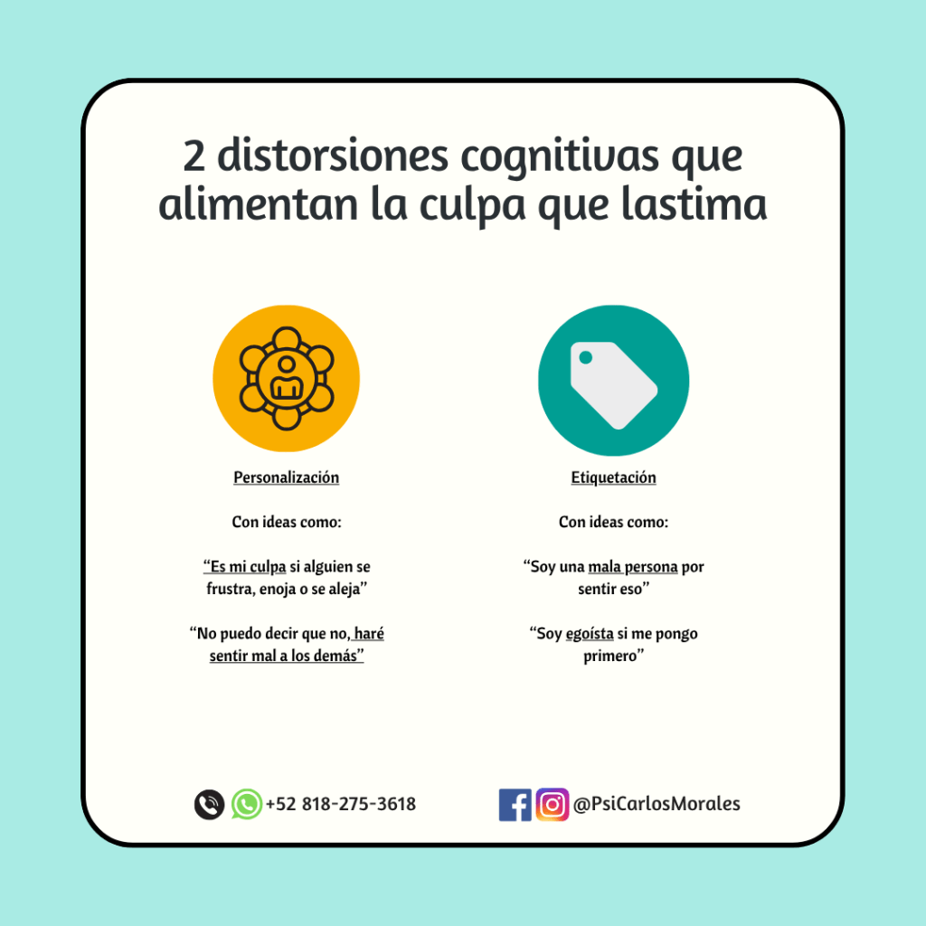 Una distorsión cognitiva muy común en personas con culpa excesiva es la personalización, que ocurre cuando se asume la responsabilidad de hechos o emociones que no dependen de uno.
