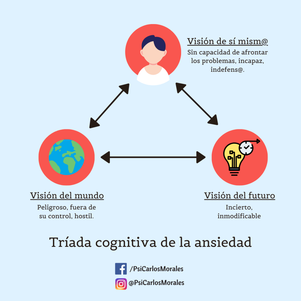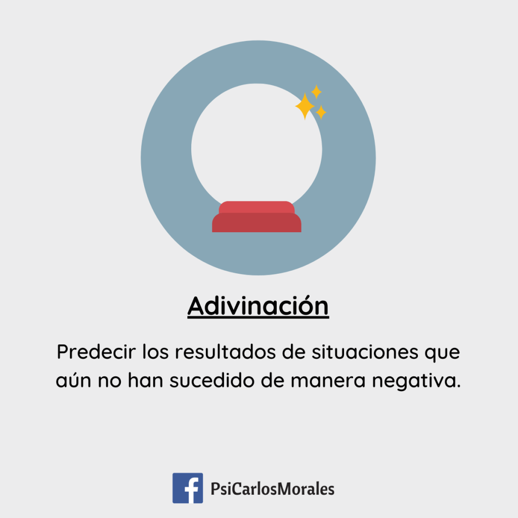 De entre esas distorsiones del pensamiento, hay 3 principales que causan la ansiedad, que son la maximización, el catastrofismo y la adivinación del futuro (si quieres saber más de cada una, puedes dar click en la imagen y ver una descripción de ellas):