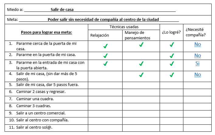 Los pasos vistos en este ejemplo pueden cambiar, lo más importante para vencer a la ansiedad, es afrontar la situación paso a paso, usar nuestras herramientas (relajación, manejo de pensamientos, contar lo positivo) y animarnos poco a poco a retomar nuestra vida, a pesar del miedo, y pidiendo ayuda si es necesario.