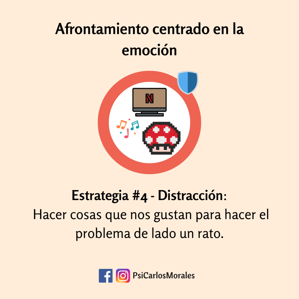 La distracción implica enfocar la mente en otra actividad para darnos un respiro emocional. Esto funciona porque a veces nos enfrascamos tanto en el problema que pensar más en él ya no sirve, la distracción sirve para pausamos y volver después a ver la situación con la mente clara.