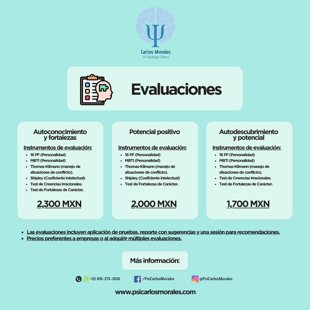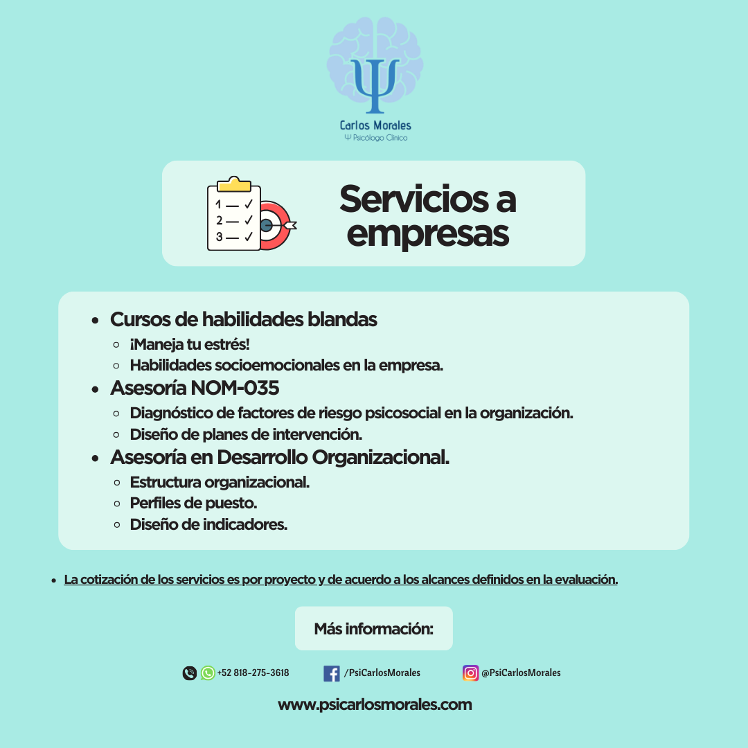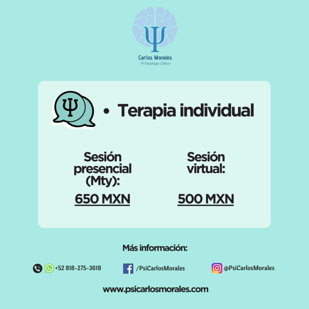 Bienvenido(a) a mi página, mi nombre es Carlos Morales y soy Lic. en Psicología y tengo formación de Maestría en Psicopedagogía y Gestión Organizacional Positiva, soy terapeuta con enfoque de terapia cognitivo-conductual de adultos.